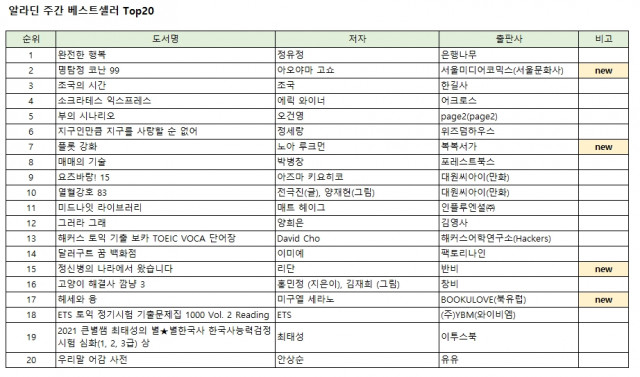 정유정 신작 소설 ‘완전한 행복’ 다시 알라딘 주간 베스트셀러 1위