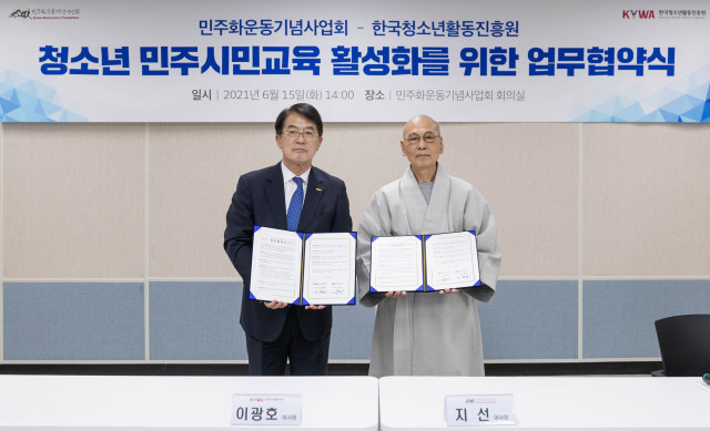 지난 6월 15일(화), 민주화운동기념사업회(이사장 지선, 이하 사업회)는 한국청소년활동진흥원(이사장 이광호, 이하 진흥원)과 오후 2시 사업회 영상회의실에서 청소년 민주시민교육 활성화를 위한 업무협약을 체결했다. 이번 협약을 통해 두 기관은 △청소년 민주시민 프로그램 및 사회참여 활동 운영 협력 △청소년 활동 지원을 위한 공간·장비·데이터 등 자원의 상호활용 및 교류 △온·오프라인 민주시민교육 콘텐츠 공동기획 및 제작 △ 청소년 민주시민교육 활성화를 위한 협력사업 공동 발굴 추진 등에 적극적으로 협력하기로 결정했다.