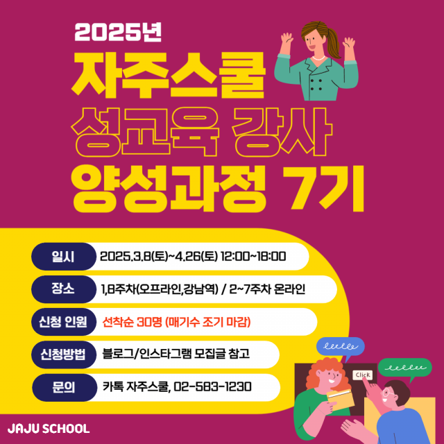 성교육·성상담 전문기관 자주스쿨이 2025년 성교육 전문 강사 양성과정 7기를 개설 및 성교육에 관심 있는 참여자를 모집한다고 전했다. 자주스쿨은 유아부터 노인까지 주기별 성교육 및 성상담을 전문적으로 제공하는 기관으로서 그동안 건강하고 안전한 성문화 조성을 위해 꾸준히 노력해 왔다. 현재까지 1만6500회 이상의 성교육 강의 진행 이력이 있으며, 7권의 베스트셀러 성교육 도서를 출간함으로써 성교육 대중화에 앞장서고 있다.