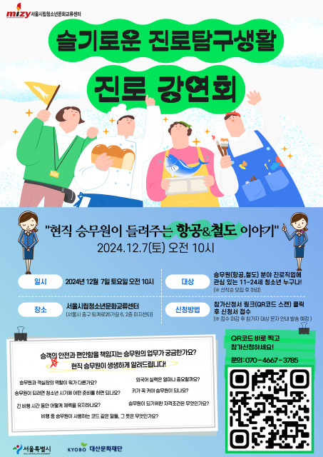 서울시립청소년문화교류센터(이하 미지센터)는 오는 11월 30일(토), 12월 7일(토) 2주간 비행관련 업무에 종사하고 있는 항공기 조종사 및 승무원을 초빙해 청소년 대상의 ‘슬기로운 진로탐구생활’을 개최한다고 밝혔다.