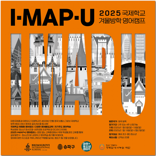 송파구립마천청소년센터는 초등학생, 중학생들의 길어진 겨울방학을 대비하고자 태국 방콕에 위치한 브롬스그로브(Bromsgrove) 국제학교에서 2025년 겨울방학 해외 영어 캠프 ‘아이맵유(I MAP U)’를 개최한다고 전했다.