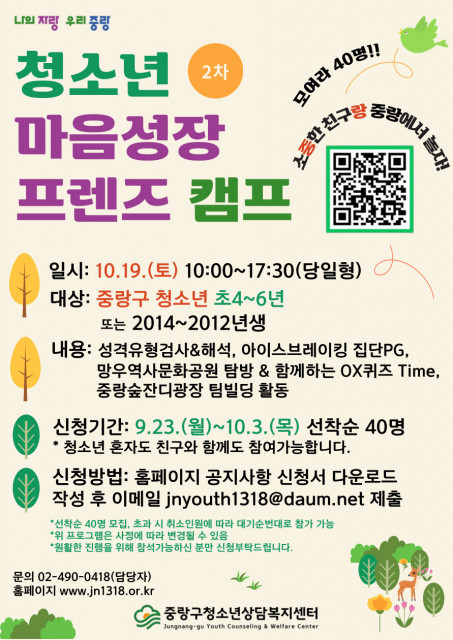 중랑구청소년상담복지센터, 2차 '마음성장 프렌즈' 캠프 참가자 모집