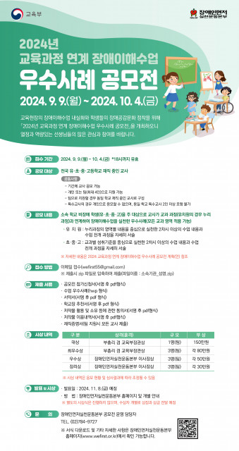 장애인먼저실천운동본부(이사장 이수성)는 교육현장에서의 장애이해수업 내실화 및 학생들의 장애에 대한 이해 증진을 도모하고자 전국의 유·초·중·고등학교에 재직 중인 교사를 대상으로 2024년 교육과정연계 ‘장애이해수업 우수사례 공모전’을 개최한다고 전했다.