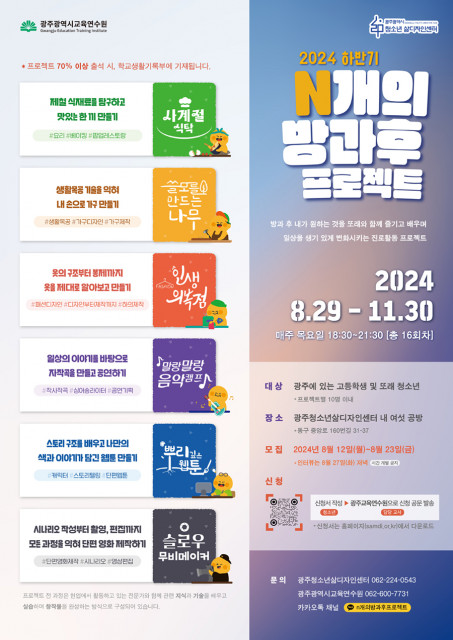 광주청소년삶디자인센터(이하 삶디)는 다가오는 8월 29일부터 11월 30일까지 매주 목요일 방과 후에 삶디 공방에서 하반기 ‘N개의 방과후 프로젝트’ 실시한다고 전했다. 23일까지 모집을 진행하며 17~19세 청소년들을 참여 대상으로 한다. 이번 프로젝트의 70%를 이수할 경우 광주교육연수원장 명의의 이수증이 발급되며 학교생활기록부에 진로 활동 이력이 기재된다.