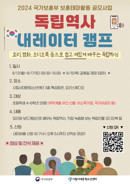 시립서대문청소년센터는 여름방학을 맞이해 청소년들을 위한 특별 캠프 프로그램 '독립역사 내레이터 캠프'를 마련했다고 밝혔다. '독립역사 내레이터 캠프'는 국가보훈부 보훈테마활동 공모사업으로, 오는 8월 12일(월)부터 17일(토)까지 서대문청소년센터에서 진행된다. 또한 참여를 위해 선착순으로 초등생 고학년 20명을 모집할 예정이며, 취약계층(저소득가정, 국가유공자 등) 청소년은 우선 신청자격이 있다.