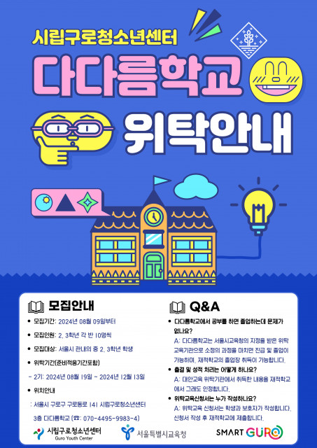 서울시 구로구 소재 시립구로청소년센터 다다름학교(교장 강정숙)는 다가오는 8월 19일(월)부터 학업 중단 위기에 놓여있는 학생과 대안교육이 필요한 중학교 2·3학년 학생을 대상으로 2024학년도 2학기 위탁교육을 운영한다고 밝혔다.