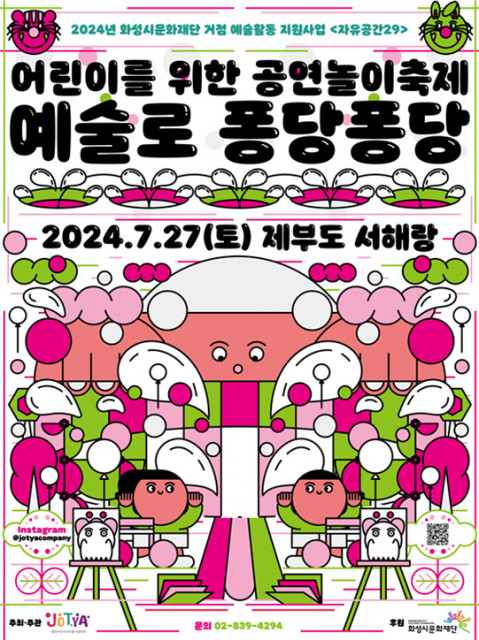 화성시문화재단(대표이사 김신아)에서는 다가오는 7월 27일(토) 어린이와 가족을 대상으로 공연놀이축제 '예술로 퐁당퐁당'을 제부도에 위치한 서해랑 제부정류장에서 개최한다고 전했다. 이번 '예술로 퐁당퐁당'은 어린이와 가족을 위한 공연 및 체험, 놀이가 조화롭게 어우러지는 축제로 컴퓨터 모니터나 스마트폰 화면에 갇혀 있는 아이들에게 보다 생생한 문화 예술 경험의 소중함을 일깨워주고, 가족과 함께 쌓는 추억의 중요성을 전하고자 하는 취지를 담고 있다.