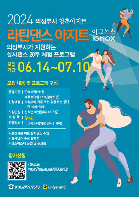 라틴댄스 강습소이자 댄스 라운지인 '이그녹스'가 의정부시 청년들을 위해 '라틴댄스 아지트' 프로그램을 진행한다고 밝혔다. 이번 프로그램은 초심자를 위한 살사댄스 체험이 가능하도록 구성되어 살사댄스 강습부터 수료 발표회, 댄스마스터 공연 및 워크숍 등을 다양하게 경험할 수 있다.