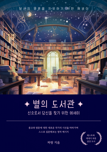 페스트북은 파랑 작가의 신작 ‘별의 도서관: 신으로서 당신을 찾기 위한 에세이’를 추천 에세이로 선정했다고 전했다. 이 책은 질문과 답의 형식을 기반으로 작가의 영적 여정과 내면 탐구를 독자에게 제시하고 있다. 페스트북은 파랑 작가의 ‘별의 도서관’은 영혼을 깊이 탐구하며 인간 존재의 근본적인 질문들에 대한 답을 하기 위한 여정을 담고 있다고 평가하며, 책을 읽다 보면 마치 명상을 하는 것과 같은 효과를 줄 뿐더러 영혼의 성장 및 자기 발견에 대한 갈망을 갖고 있는 모든 이들에게 영감을 줄 것이라고 추천 이유를 설명했다.