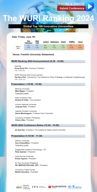 주요 대학의 혁신 수준 평가 ‘WURI 2024’ 7일 스위스 프랭클린 대학에서 발표