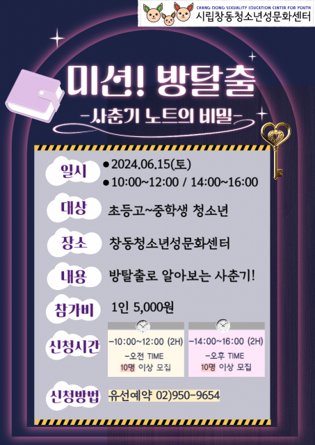 시립창동청소년성문화센터는 다가오는 6월 15일(토) 사춘기 시기에 놓여있는 초등 고학년부터 중학생 청소년들을 대상으로 단순 교육이 아닌 체험활동을 기반으로 사춘기에 일어나는 다양한 변화에 대해 이해하고 보다 긍정적인 사춘기를 보낼 수 있도록 올바른 성지식을 함양하는 것을 목적으로 하는 방탈출 형식의 청소년 성교육 프로그램을 진행한다고 전했다.