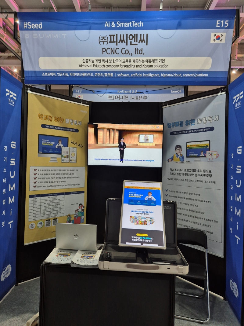 AI 독서 및 한국어교육 토핑(TOAPING) 서비스를 운영하는 ㈜피씨엔씨(이하 피씨엔씨, 대표 김덕기)는 10월 1일(수)부터 2일(목)까지 양일간 수원컨벤션센터에서 개최되는 ‘2025 경기 스타트업 서밋(G-SUMMIT)’에 참가한다고 밝혔다.