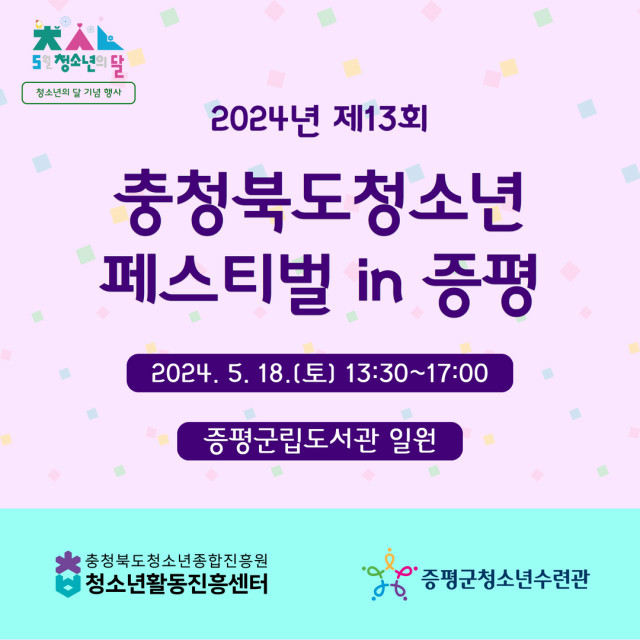 5월 18일(토), 충청북도청소년종합진흥원(원장 홍상표) 청소년활동진흥센터는 청소년의 달을 맞이해 13시 30분부터 증평군립도서관 일원에서 '제13회 충청북도청소년페스티벌'을 개최한다고 밝혔다. 충청북도청소년페스티벌은 올해로 제13회를 맞이했으며 증평군청소년수련관과의 공동 운영을 통해 증평군에서 개최한다. 또한 증평군과의 협력은 충청북도청소년페스티벌을 시작한 이래 최초로, 향후 다양한 기초자치단체와 함께 공동 운영을 해나갈 계획을 갖고 있다.