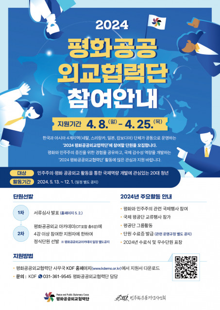4월 8일(월), 민주화운동기념사업회(이사장 이재오, 이하 사업회)가 ‘2024 평화공공외교협력단’ 단원을 오는 4월 25일(목)까지 모집한다고 전했다. '평화공공외교협력단'은 사업회와 아시아 4개 지역인 네팔, 스리랑카, 일본, 캄보디아가 단체로 공동 운영하는 민주주의 공공외교 청년 프로그램이다.