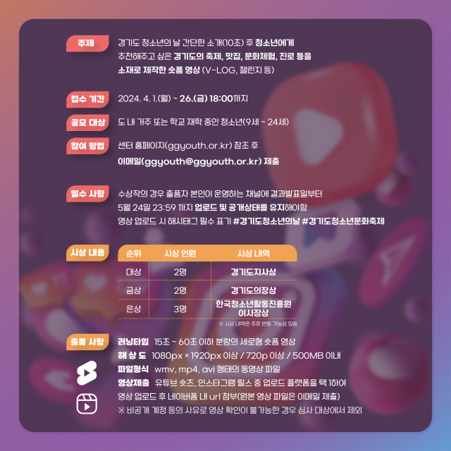 경기도청소년활동진흥센터(센터장 권구연)는 오는 4월 26일(금)까지 경기도 청소년 진로·문화 축제 관련 ‘숏폼 공모전’을 모집한다고 전했다. 숏폼 공모전은 '청소년에게 추천해 주고 싶은 경기도의 축제, 맛집, 문화체험, 진로 등’을 주제로 하여 영상을 제작한 후 이메일로 신청할 수 있다.
