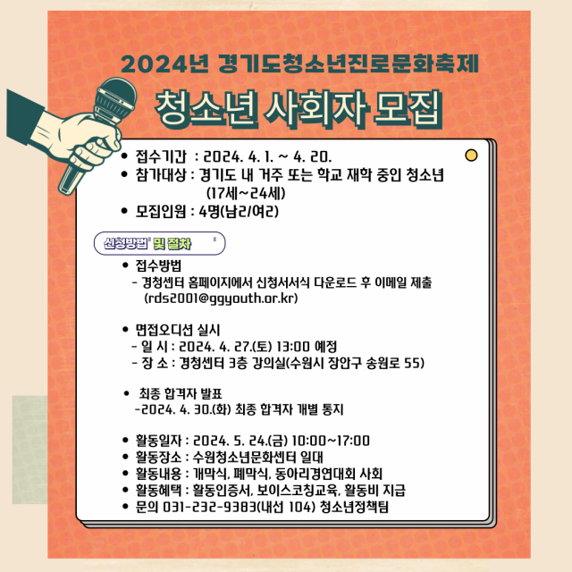 경기도청소년활동진흥센터(센터장 권구연)에서 2024년 경기도청소년진로문화축제를 이끌 청소년 사회자를 모집한다고 밝혔다. 경기도 내 거주 또는 학교에 재학 중인 17세~24세 동일 연령 청소년이라면 신청이 가능하고 오는 20일까지 이메일을 통해 신청할 수 있다.