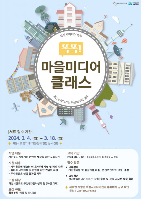 화성시문화재단(대표이사 김신아) 화성시미디어센터는 오는 3월 4일(월)부터 18일(월)까지 '2024 찾아가는 마을미디어 교육 - 똑똑! 마을미디어 클래스' 참여 단체를 모집한다고 밝혔다. 이번 클래스는 시민이 직접 지역의 이야기를 아카이빙하고 지역 관련 콘텐츠를 제작하는 '마을미디어활동가'를 양성하기 위한 교육지원 사업이다.