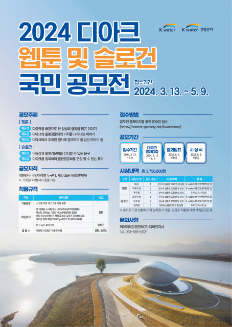 K-water낙동강보관리단(단장 정용채)과 케이워터운영관리 디아크지사(지사장 박홍석)는 디아크(The ARC)를 활용한 다양한 콘텐츠 융합 국민 체감형 물환경문화서비스를 발굴하고자 13일부터 '2024 디아크 웹툰 및 슬로건 국민 공모전'을 개최한다고 전했다.
