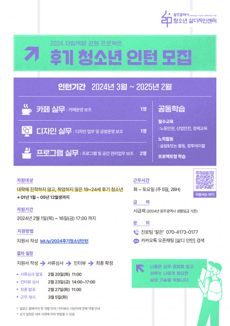 광주청소년삶디자인센터(이하 삶디)가 대학 비진학 또는 미취업 청소년들이 일 경험을 통해 자신의 진로를 설계해 가는 '자립역량 강화 프로젝트' 참여자를 모집한다고 전했다. 참여자들은 카페와 디자인, 프로그램 실무 중 선택해 일을 하게 되는데 카페 실무의 경우 음료 제조 등 카페 운영 전반에 걸친 업무를 배우게 된다. 또한 디자인 실무는 시각 디자인 작업 및 삶디공방에서 운영을 보조하게 되며 프로그램 실무는 체험 프로그램을 진행하며 삶디 공간 관리 운영 업무를 맡게 된다.