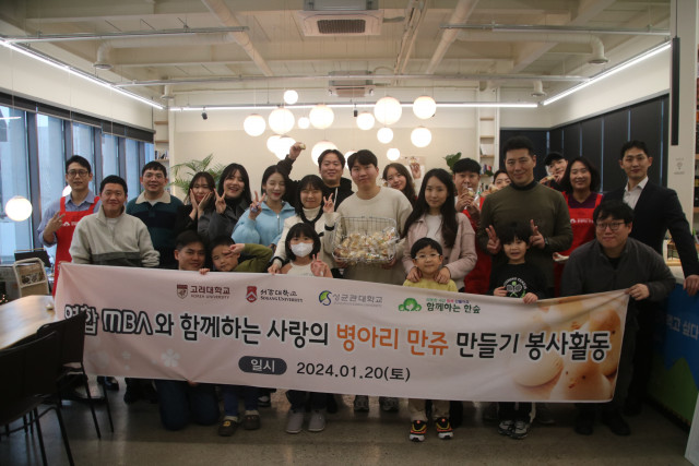 지난 1월 20일(토), 따뜻한 세상을 만들어가는 함께하는 한숲(Together Hansup)과 함께 고려대, 서강대, 성균관대 연합 MBA는 '사랑의 병아리 만쥬 만들기' 봉사활동을 진행했다고 전했다. 사랑의 병아리 만쥬 만들기 봉사활동의 경우 지역아동센터 아동·청소년을 대상으로 연합MBA 자원봉사자들이 함께 참여해 아이들에게 전할 간식을 직접 만들어 전달함으로써 사랑과 온정을 나누는 캠페인이다.