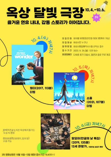 시립왕배푸른숲도서관(운영: 화성시문화재단)은 황금연휴를 맞이하여 10월 4일(수)부터 6일(금)까지 도서관 3층 옥상쉼터에서 19시에 ‘옥상 달빛 극장’을 집중 운영한다고 전했다. 옥상 달빛 극장은 왕배푸른숲도서관 옥상에서 가족, 친구들과 다함께 영화를 관람하며 즐거운 시간을 보낼 수 있도록 마련된 사업으로, 총 10편의 영화로 알차게 구성했다. 각 회차별로 모집 인원은 50명이며, 화성시민이라면 누구나 참여가 가능하다.