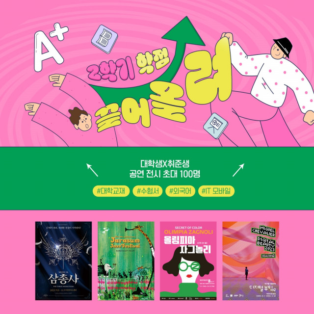 문화콘텐츠 플랫폼 예스24가 개강 시즌을 맞이해 인기 공연 및 전시에 대한 대한 초대 이벤트를 진행한다고 밝혔다. 대학생과 취업준비생들의 힘찬 출발을 응원하고자 마련된 이번 이벤트는 뮤지컬 ‘삼총사’, 공연 ‘제20회 자라섬 재즈페스티벌’, 전시 ‘시크릿 오브 컬러 올림피아 자그놀리’, ‘미구엘 슈발리에 디지털 뷰티 시즌2’까지 총 4편의 티켓을 마련했으며, 추첨을 통해 총 100명(50팀)에게 관람 티켓을 선물할 예정이다.