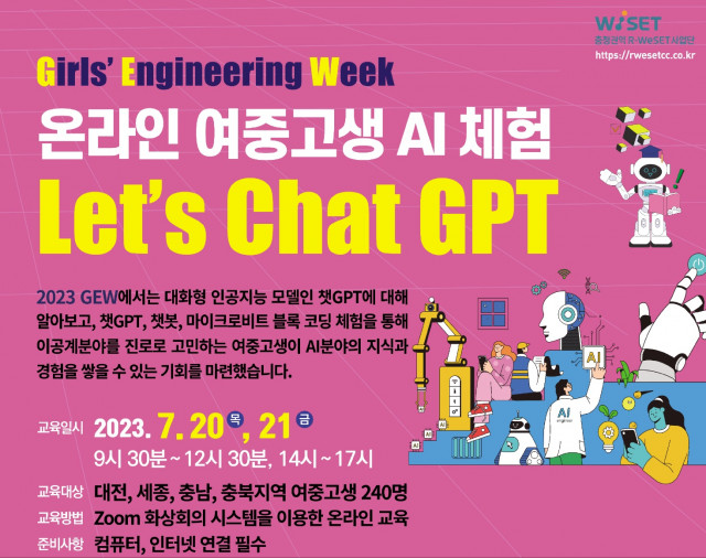 지난 7월 12일(수)부터 21일(금)까지 여학생 공학주간(Girls’ Engineering Week, GEW)을 맞아 청권역 R-WeSET사업단(단장 이선영 충남대학교 교수)은 온·오프라인 여중고생 AI 체험 행사를 운영했다고 전했다.
