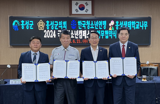 지난 6월 21일(수), 한국청소년연맹(총재 임호영)과 성군, 홍성군의회, 홍성생태학교나무는 홍성군청에서 한국청소년연맹 임호영 총재, 홍성군 이용록 군수, 홍성군의회 이선균 의장, 홍성생태학교나무 모영선 이사장이 참석한 가운데 홍성군이 유치한 '2024 국제청소년캠페스트'의 성공적인 개최를 위해 업무협약을 체결했다.