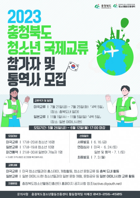 충청북도는 청소년 글로벌 역량 강화를 위한 '2023 충청북도 청소년 국제교류' 참가자를 모집한다고 전했다. 이번 청소년 국제교류 행사는 7월 21일부터 25일까지 미국 청소년 초청교류, 11월 1일부터 5일까지 일본 야마나시현 방문교류로 진행된다.