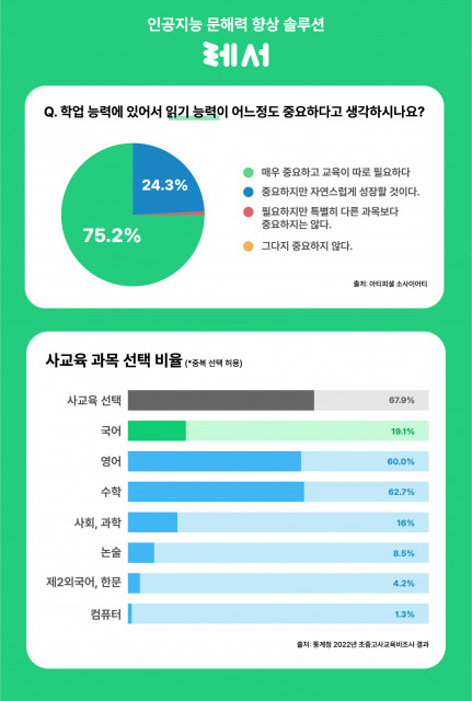 지난 6월 1일(목), 인공지능 문해력 향상 솔루션 앱 ‘레서’를 운영하고 있는 에듀테크 스타트업 아티피셜 소사이어티가 5월 9일부터 12일까지 600명의 학생 및 학부모를 대상으로 실시한 문해력 관련 인식 조사 결과를 발표했다.