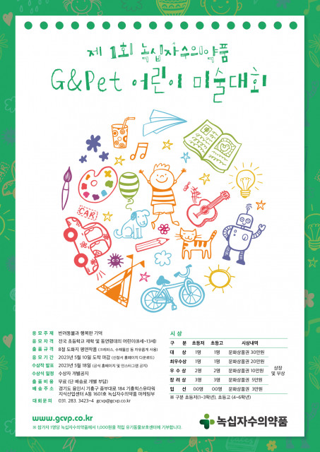 3월 29일(수), 녹십자수의약품은 창립 50주년 기념 '반려동물과 행복한 추억'이라는 주제를 바탕으로 제1회 G&Pet 어린이 미술대회를 개최한다고 밝혔다. 초등학생 및 동일 연령의 어린이라면 누구든 참가할 수 있으며 저학년부, 고학년부로 나누어 시상이 진행될 예정이다. 이번 미술대회 참가를 희망하는 경우 5월 10일(수)까지 우편을 통해 작품 접수가 가능하며, 5월 18일 수상작 발표, 시상식 순으로 진행된다. 또한 대회와 관련하여 보다 자세한 내용은 홈페이지를 통해 확인할 수 있다.