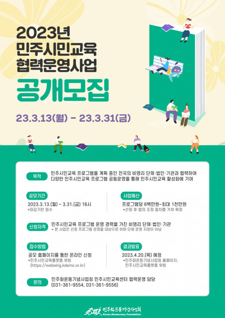 민주화운동기념사업회(이사장 지선, 이하 사업회)가 다가오는 3월 31일(금) 오후 4시까지 '2023년 민주시민교육 협력운영사업(이하 협력운영사업)’의 참여단체를 모집한다고 밝혔다. 이번 협력운영사업은 민주시민교육을 활성화하고자 관련 단체 및 기관과의 협력을 통해 다양한 민주시민교육 프로그램을 공동으로 운영하는 사업이다.