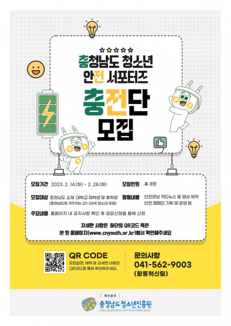 충청남도청소년진흥원(원장 직무대리 이순실) 활동진흥센터는 2월 28일(화)까지 도내 안전 문화를 확산하고 청소년들의 안전 의식을 높이는 데 기여할 수 있는 충청남도 청소년 안전 서포터즈 ‘충.전.단’(이하 안전 서포터즈)을 모집한다고 밝혔다.