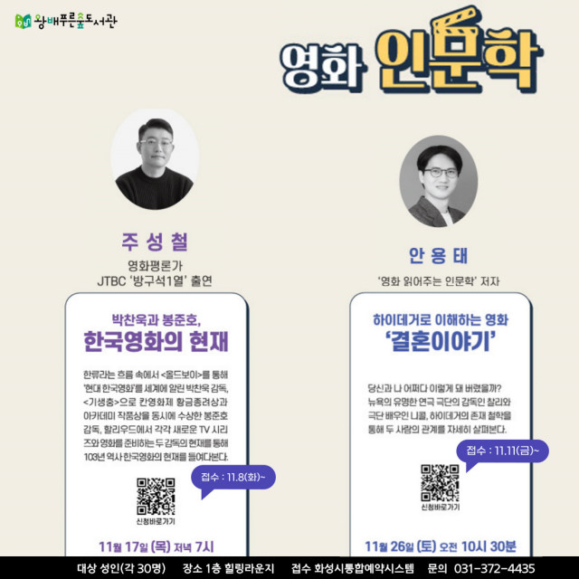 화성시문화재단(대표이사 김종대) 왕배푸른숲도서관이 다가오는 11월 17일(목), 26일(토) 지역 주민을 대상으로 '영화 인문학' 강연을 운영한다고 밝혔다. 왕배푸른숲도서관은 지난 9월 성황리에 마무리한 ‘옥상달빛극장(심야 영화 상영)’에 이어 시민의 인문학적 소양 및 지역사회의 독서문화 활성화에 기여하기 위해 이번 강연을 준비했다.