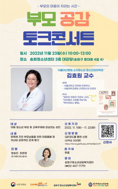 지난 11월 8일(화), 송파구청소년상담복지센터(센터장 김세희)는 23일 서울아산병원 정신건강의학과 김효원 교수를 초청해 ‘부모 마음 돌봄 및 자녀와 건강한 관계 맺기’에 대한 주제로 부모 공감 토크콘서트를 개최한다고 밝혔다. 이번 콘서트는 청소년 자녀를 둔 부모들의 지쳐있는 마음을 위로하고 양육 고민을 함께 나누고자 기획되었으며 전 MBC 아나운서이자 심리상담사로 활동하고 있는 최현정 아나운서가 진행을 맡는다.