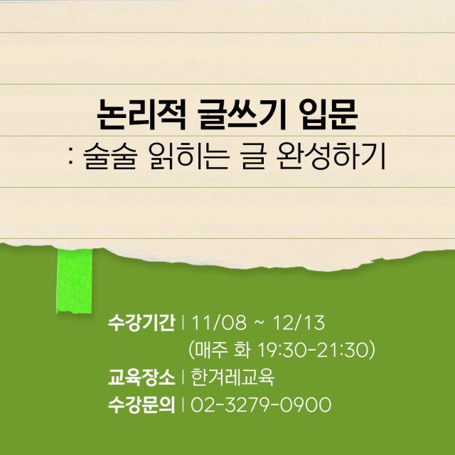 지난 10월 26일(수), 한겨레교육이 성인 대상의 글쓰기 강좌 '논리적 글쓰기 입문'을 개강할 예정이라고 밝혔다. 이번 강좌는 SNS, 블로그, 일기, 보고서, 기획안 등 일상 속에서 글쓰기 활용도가 높아지고 있는 반면, 논문을 작성해야 하는 대학원생들도 글쓰기를 배워야 할 만큼 문해력이 점차 떨어지고 있는 현실 속에서 논리적으로 사고할 수 있는 체계를 익히고자 개강할 마련됐다.