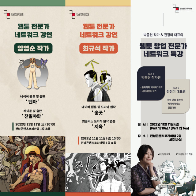 11월 11일(금), 전남정보문화산업진흥원은 전남 지역의 웹툰 창작 활성화를 목적으로 현직에서 활발히 활동 중인 웹툰 유명 작가, 웹툰 창업 전문가와 함께 전남콘텐츠코리아랩에서 웹툰 전문가 강연을 진행한다. 이번 강연은 2022년 전남콘텐츠코리아랩 '성과공유회' 행사 중 일부로 진행되며, 웹툰 전문가 4인을 초빙해 차별화되고 깊이 있는 강연이 진행될 예정이다. 평소 웹툰을 좋아하고 웹툰 창작 및 창업에 관심있는 사람이라면 누구나 행사에 참여가 가능하다.