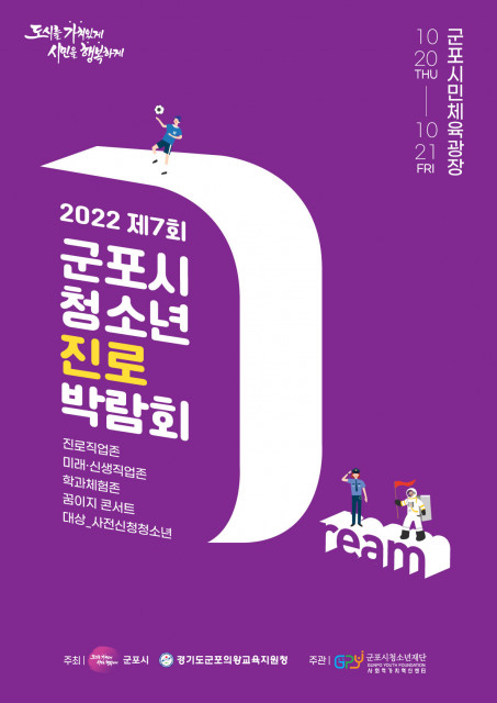 지난 10월 19일(수), 주관사 군포시청소년재단 사회적가치혁신센터는 제7회 군포시 청소년진로박람회(주최: 군포시, 군포의왕교육지원청)가 10월 20일부터 21일까지 양일간 개최된다고 밝혔다. 센터는 2016년부터 군포시 청소년들의 진로 탐색을 위해 필요한 기준을 발견할 수 있도록 해마다 청소년진로박람회를 개최해 왔다. 장기화되고 있는 코로나19 사태로 인해 2020년과 2021년은 온라인 진로박람회 형태로 개최했고, 올해는 2019년 이후 3년 만에 대면으로 실시한다.