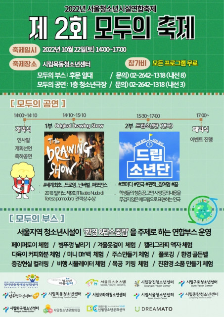 시립목동청소년센터(관장 이재영)는 장기화되고 있는 코로나19 사태로 인해 침체한 청소년 활동을 활성화하고, 지역 기반의 네트워크 형성과 청소년 화합의 기초를 마련하고자 '서울청소년시설연합축제 제2회 모두의 축제'를 오는 10월 22일(토) 오후 1시부터 오후 5시까지 개최한다. 이번 축제는 오후 2시부터 오후 5시까지 진행되는 모두의 공연과 오후 1시부터 오후 5시까지 진행되는 모두의 부스로 나뉘어 진행하며, 2개 공연과 17개의 체험 부스가 운영된다.