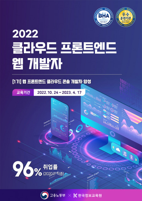 베스트직업훈련기관 한국정보교육원(원장 고현정)이 2022년 10월 웹 프론트엔드 클라우드콘솔 개발자 양성 과정 1기 교육을 개설한다고 밝혔다. 이번 과정은 프론트엔드 웹 개발의 기초부터 클라우드 콘솔 개발 실무까지 경험할 수 있도록 탄탄한 커리큘럼으로 구성했으며 2022년 10월 24일부터 2023년 4월 17일까지 약 6개월 동안 교육이 진행된다. 또한 10월 28일까지 참가 신청을 할 수 있다.