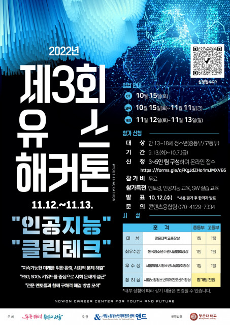 서울시가 설립하고 광운대학교가 운영하는 시립노원청소년미래진로센터(이하 앤드센터)가 다가오는 2022년 11월 12일(토)과 13일(일) 양일간 제3회 유스해커톤 대회 개최를 통해 청소년의 창의·융합 핵심 역량 강화 도모에 나선다. 앤드센터가 개최하는 이번 제3회 유스해커톤 대회는 청소년(Youth), 해킹(Hacking), 마라톤(Marathon)의 합성어로, 소프트웨어 융합기술에 관심 있는 만 13~18세 청소년이 팀을 구성해 함께 아이디어를 도출하고 협업을 통해 창작물을 만들어내는 경진대회다.