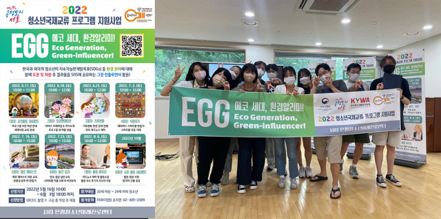 시립 은평청소년미래진로센터(이하 ‘궁리하다센터’)는 여성가족부와 한국청소년활동진흥원이 주최, 궁리하다센터가 주관하는 이번 2022년 청소년 국제 교류 프로그램 지원 사업 'Eco Generation, Green-influencer (EGG)' 프로그램이 지난 6월 11일부터 10월 1일까지 총 8회에 걸쳐 진행했다고 밝혔다. 이번 프로그램은 장기화되고 있는 코로나19로 인해 위축된 청소년 교류 활동에 지속가능개발목표(SDGs) 중 ‘환경’ 분야에 중점을 둔 융합형 국제 교류 프로그램이며 일본, 중국, 러시아, 한국 총 4개국에서 11명의 청소년이 참가했다.
