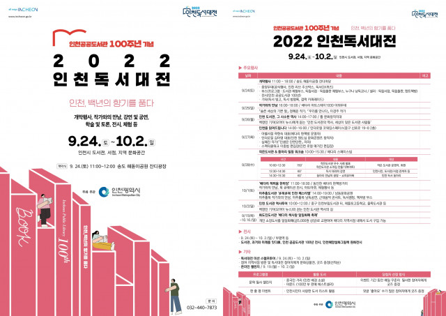 인천광역시(시장 유정복)은 다가오는 9월 24일(토)부터 10월 2일(일)까지 9일간 공공도서관과 작은 도서관, 서점, 지역 문화공간에서 '2022 인천 독서대전'을 개최한다고 밝혔다. 인천 공공도서관은 개관 100주년을 기념하기 위해 이번 행사를 마련했으며 지난 2015년 인천에서 개최된 '대한민국 독서대전' 이후 개최되는 인천 최대 규모의 독서 축제라 할 수 있다.