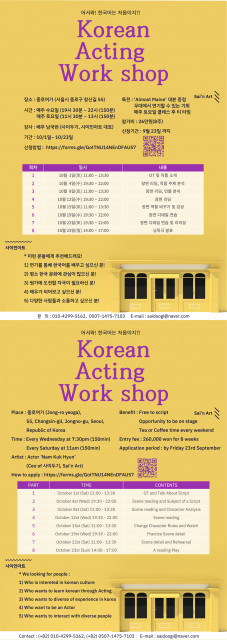 종로사회적경제네트워크사회적협동조합(이사장 이학송, 이하 종로사협)이 다가오는 10월 1일부터 발굴 창업팀이 외국인을 대상으로 진행하는 '한국어 연기 워크숍(Korean Acting Workshop)'을 후원한다고 밝혔다. 사이인아트는 일반인들이 보다 쉽고 즐겁게 예술 체험을 할 수 있도록 만든 인터랙션 형태의 아트 플랫폼 회사로서 종로사협이 운영하는 종로여가의 문화 예술 투어 콘텐츠 발굴 사업을 통해 창업했다.