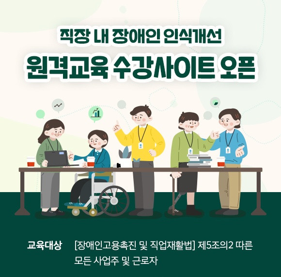 성남시 장애인권리증진센터(이하 ‘센터’)가 2022년도 직장 내 장애인 인식개선을 위한 온라인 교육 사이트를 전국 모든 사업주 및 근로자로 교육 대상을 확대했다고 밝혔다. 직장 내 장애인 인식개선 교육이란 장애인고용촉진 및 직업재활법 제5조의 2항에 따라 모든 사업주와 근로자가 반드시 이수해야만 하는 교육으로 장애인에 대한 직장 내 편견을 제거함으로써 장애인 근로자의 안정적인 근무 요건을 조성하고자 하기 위함이다.