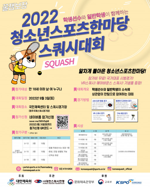 8월 5일(금), 대한스쿼시연맹(회장 허태숙, 이하 연맹)은 9월 3일(토) 충청북도 청주에 위치한 청주국제스쿼시경기장에서 '2022 청소년스포츠한마당 스쿼시대회'를 주관해 개최한다고 밝혔다. 이번 대회는 대한체육회(회장 이기흥, 이하 체육회)가 주최, 교육부와 국민체육진흥공단의 후원으로 진행되며 학생 선수와 일반 학생이 한팀으로 참여하게 된다.