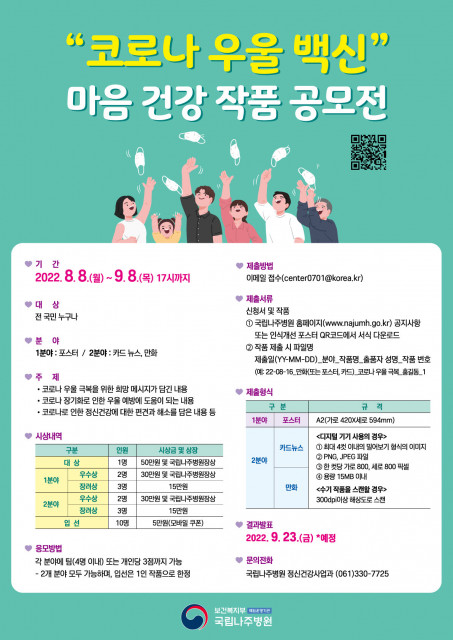 지난 8월 8일(월), 국립나주병원(원장 윤보현)은 2022년 ‘코로나 우울 백신 마음 건강 작품 공모전’을 개최한다고 밝혔다. 정신건강 관리의 중요성을 알리고, 온 국민이 함께하는 대국민 정신건강 문화를 조성하고자 진행되는 이번 공모전은 8월 8일(월)부터 9월 8일(목)까지 대한민국 국민 누구나 응모 가능하며, 국립나주병원 홈페이지에서 자세한 참여 방법을 확인할 수 있다.
