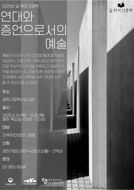 금천문화재단(대표이사 서영철) 금천구립독산도서관은 오는 6월 19일(월)부터 예술을 다룬 두 가지 인문학 강연 ‘연대와 증언으로서의 예술’과 ‘이야기가 만든 세상, 이야기가 만들 세상’을 진행한다고 전했다. 이번 강연은 한국문화예술위원회에서 주관하는 공모사업으로 ‘길 위의 인문학’에 금천구립독산도서관이 선정돼 마련했다. 또한 예술 특화 도서관인 금천구립독산도서관은 예술을 다루는 두 강연을 기반으로 지역주민이 인문학이라는 분야를 보다 쉽게 접하고 예술의 사회적 가치를 새롭게 발견할 수 있는 기회를 제공할 예정이다.