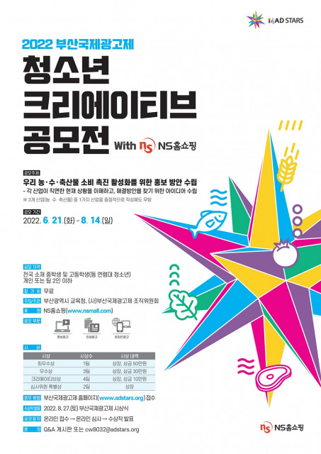 부산국제광고제가 국내 청소년 대상 '2022 청소년 크리에이티브 공모전'을 개최한다. 부산광역시교육청, 부산국제광고제가 공동 주최하고 NS홈쇼핑이 후원하는 이번 공모전은 ‘우리 농·수·축산물 소비 촉진 활성화를 위한 홍보 방안 수립’이라는 주제를 기반으로 진행된다. 이를 통해 물가 급등으로 인한 각 산업의 현실적인 어려움을 이해하고, 청소년들의 시선으로 지역 경제 활성화 및 소비 촉진을 위한 해결 방안을 제시하고자 한다.