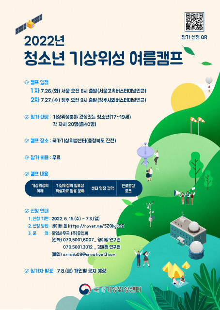 국가기상위성센터(센터장 김윤재)가 6월 15일(수)부터 7월 3일(일)까지 ‘2022년 청소년 기상위성 여름캠프(이하 여름캠프)’ 참가자를 모집한다. 이번 여름캠프는 진로체험 프로그램으로 기상위성 분야의 전문가를 꿈꾸고 있는 청소년들을 응원하고자 마련되었으며 지난 2021년에 이어 두 번째 진행한다. 7월 26일(화), 27일(수) 양일간 국가기상위성센터에서 진행되며, 17~19세 청소년 누구나 참여가 가능하다.